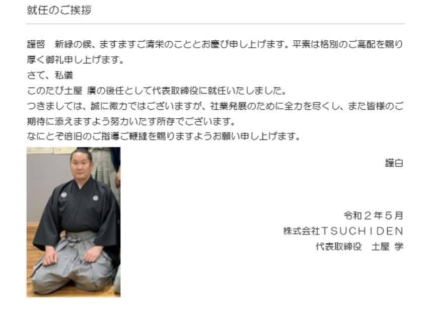 このたび株式会社TSUCHIDEN代表取締役を退任し取締役会長に就任致しました。在任中は公私にわたり格別のご懇情を賜り感謝に堪えません。